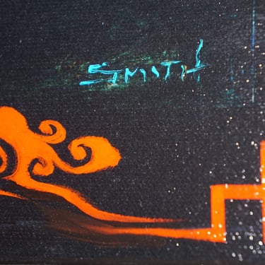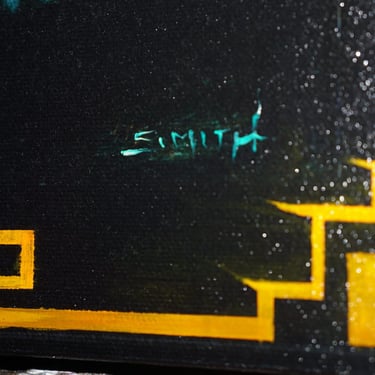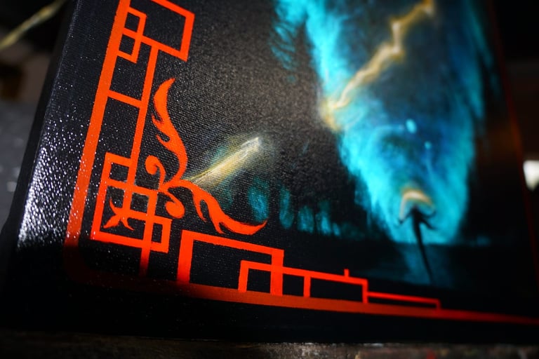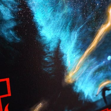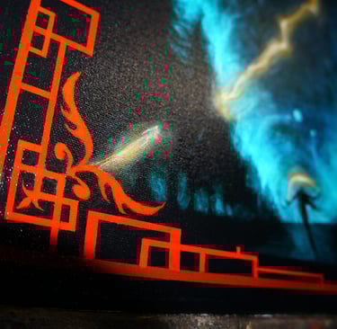 The prints / "giclees", are printed with archival inks and on acid-free, archival, fine-art canvas, and are "gallery wrapped" with 1.5" sides. The lightning bolts, framing designs, and embellishments are painted with oils, and the surface has been gloss varnished.