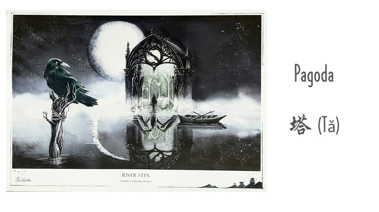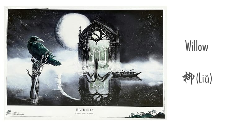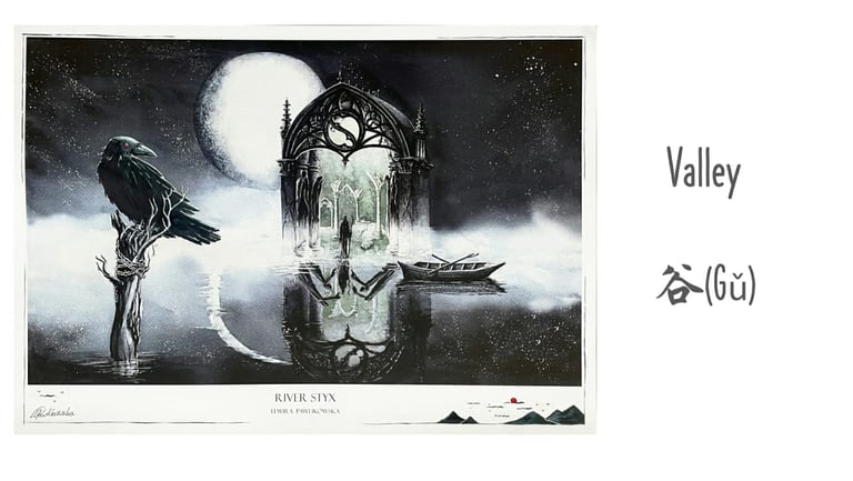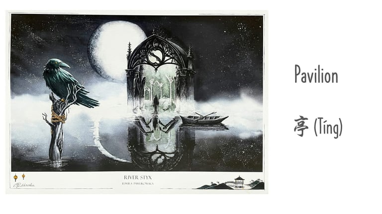 The subtle yet beautiful Asian touch comes in the form of a black border and panoramic view envisioned by Elwira that matches River Styx. This way, the original art is preserved in its full glory, while these added frames form a series of 5 unique pieces that have been titled with individual names coupled with corresponding Han characters, that respects the specific nature of each piece. Here is a process video to showcase how she brings some of the elements to life!